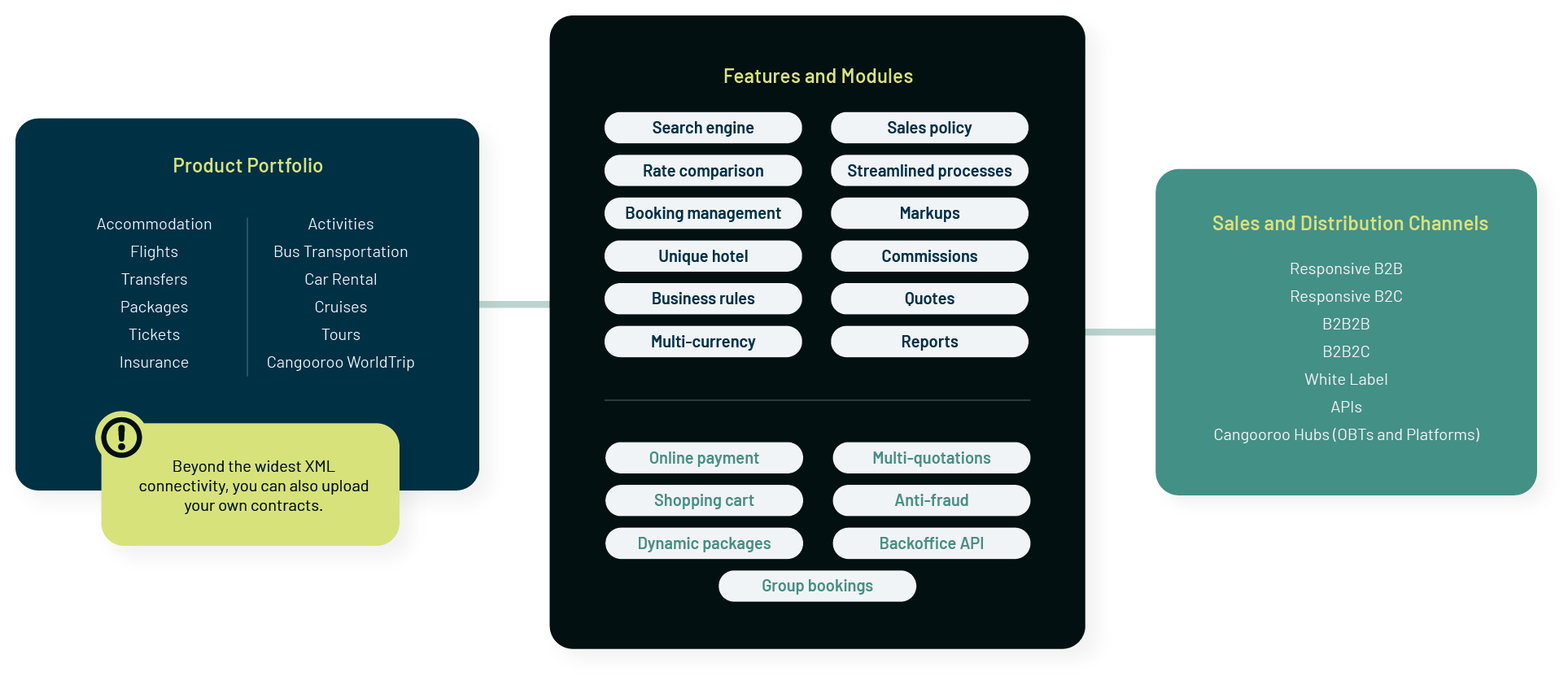 Cangooroo was developed to operate in a widely connected ecosystem, offering integration with a large variety of suppliers and services from the tourism sector. The platform connects directly to inventories of hotels, flights, cars, transfers, tours, insurance, and packages, allowing companies to work with a robust and always updated portfolio.